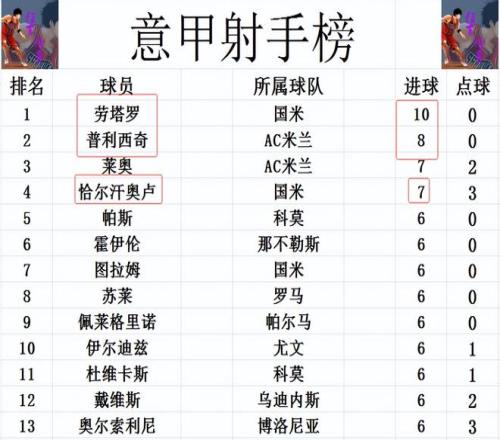 射手榜方面,劳塔罗今天未能进球,还是10球领跑,普利西奇8球位列第2。恰尔汗奥卢点射建功,追上莱奥,两人7球并列第3。佩莱格里诺则是追上苏莱,图拉姆和霍伊伦等人6球刚好挤入前十。
